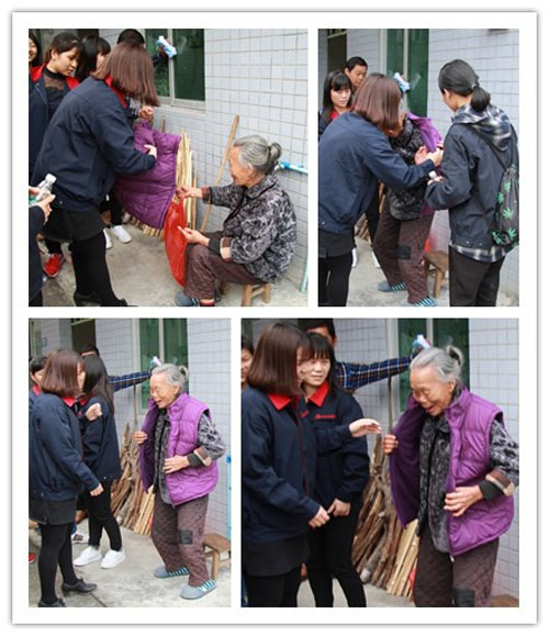 這位老人家80多歲,患有眼疾,一人獨自生活(房子為政府補貼)。大家像對待家里的奶奶一樣,幫助她穿上棉衣,試試是否合身。奶奶開心地試穿新衣服,再三跟大家道謝。