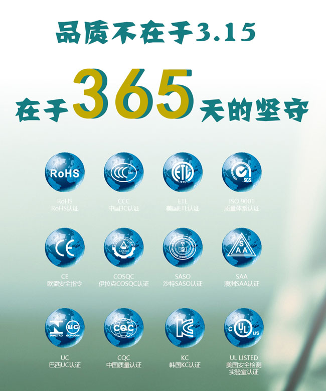 產(chǎn)品已通過ISO9001質(zhì)量認證、ISO14001環(huán)境認證、國家CCC、歐共體CE、ROHS、澳洲OC認證和美國MET(UL)等多項國內(nèi)外認證,遠銷80多個國家和地區(qū)。