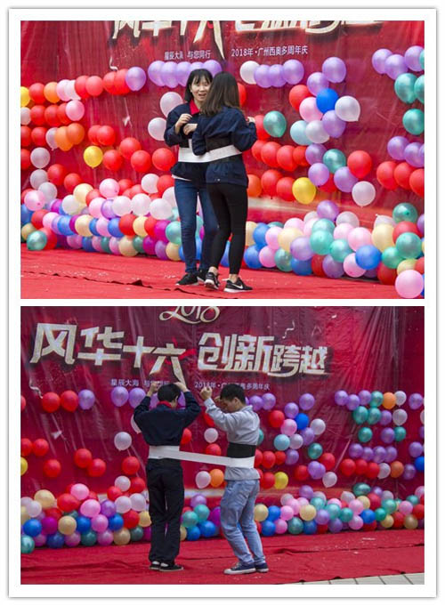 通過(guò)轉(zhuǎn)圈方式把腰上的布條纏到隊(duì)友上,纏的過(guò)程中不可以用手觸屏。大家為了比賽,為了榮譽(yù),也為了歡笑,各出奇招,現(xiàn)場(chǎng)一片歡鬧。