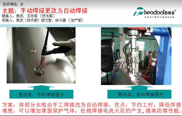 蘇:生產(chǎn)部在今年1月至9月共提出“持續(xù)改善”點1314條,約占公司總改善點的60%。改善的內容包括:工藝技術、現(xiàn)場管理、節(jié)約耗能等等,例如:由手動人工焊接操作改進為自動焊接操作,焊接工藝已達成熟,進一步提高產(chǎn)品質量。